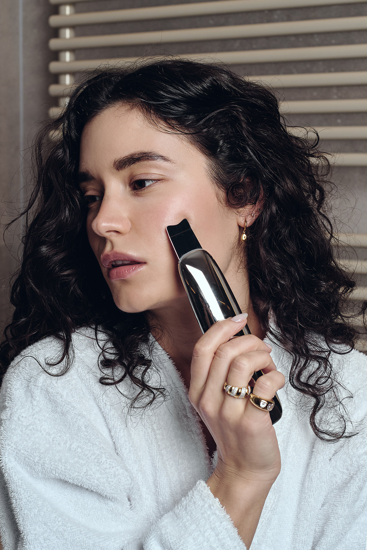 Ultrazvučna tehnologija koristi visokofrekventne zvučne vibracije (iznad 20 kHz) za učinkovito uklanjanje nečistoća i sebuma iz pora. Potiče mikrocirkulaciju i smanjuje natečenost, ostavljajući kožu čistom i glatkom. Koristiti 1–2 puta tjedno na vlažnoj koži.